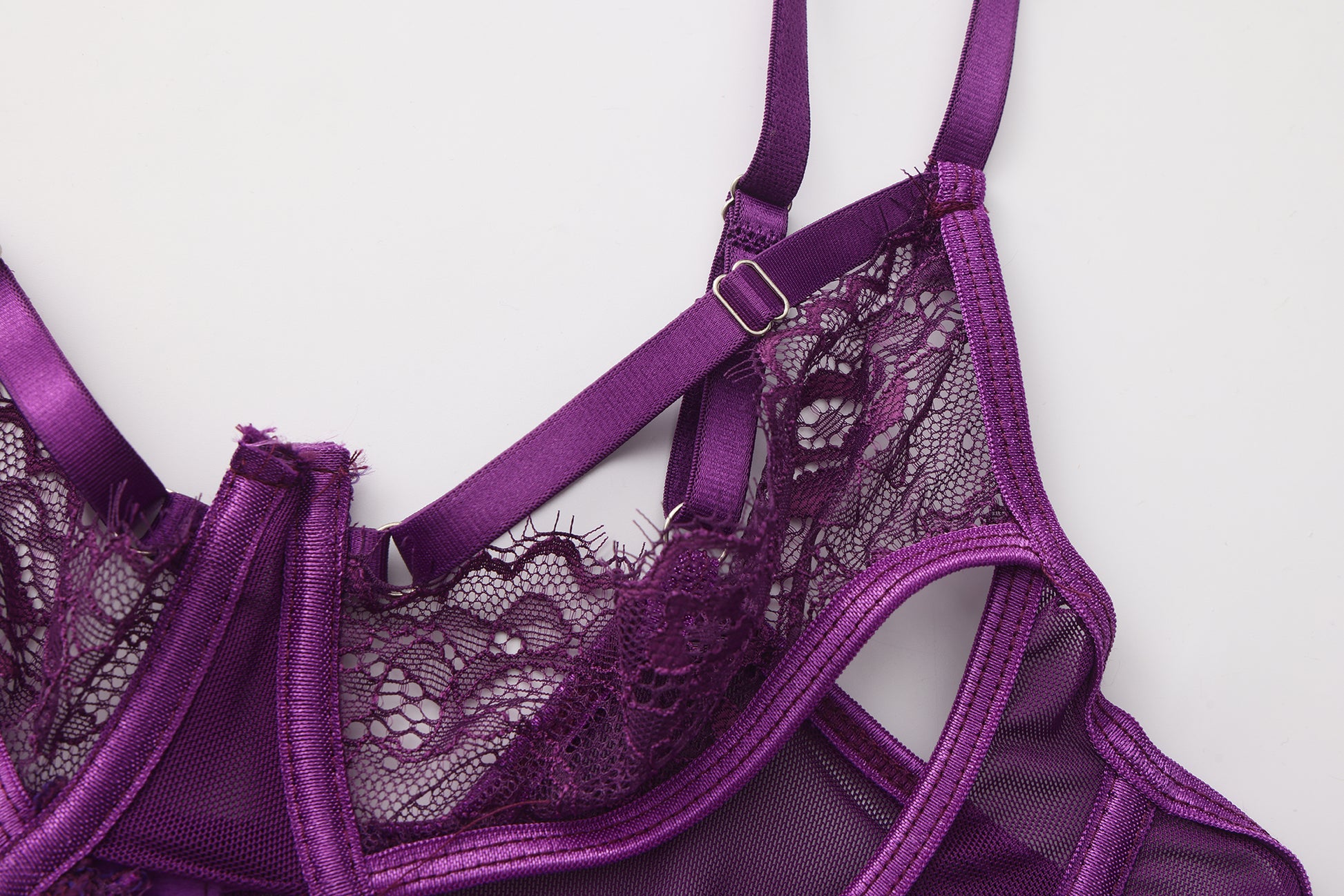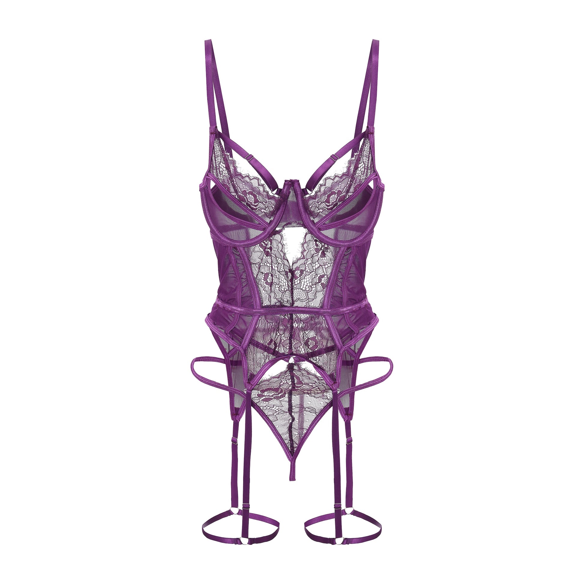 Striking and seductive, this deep purple bustier is crafted from sheer lace and mesh with structured seams that sculpt the waistline. Underwire cups provide gentle lift and support, while adjustable straps and attached garters allow for a personalized fit.