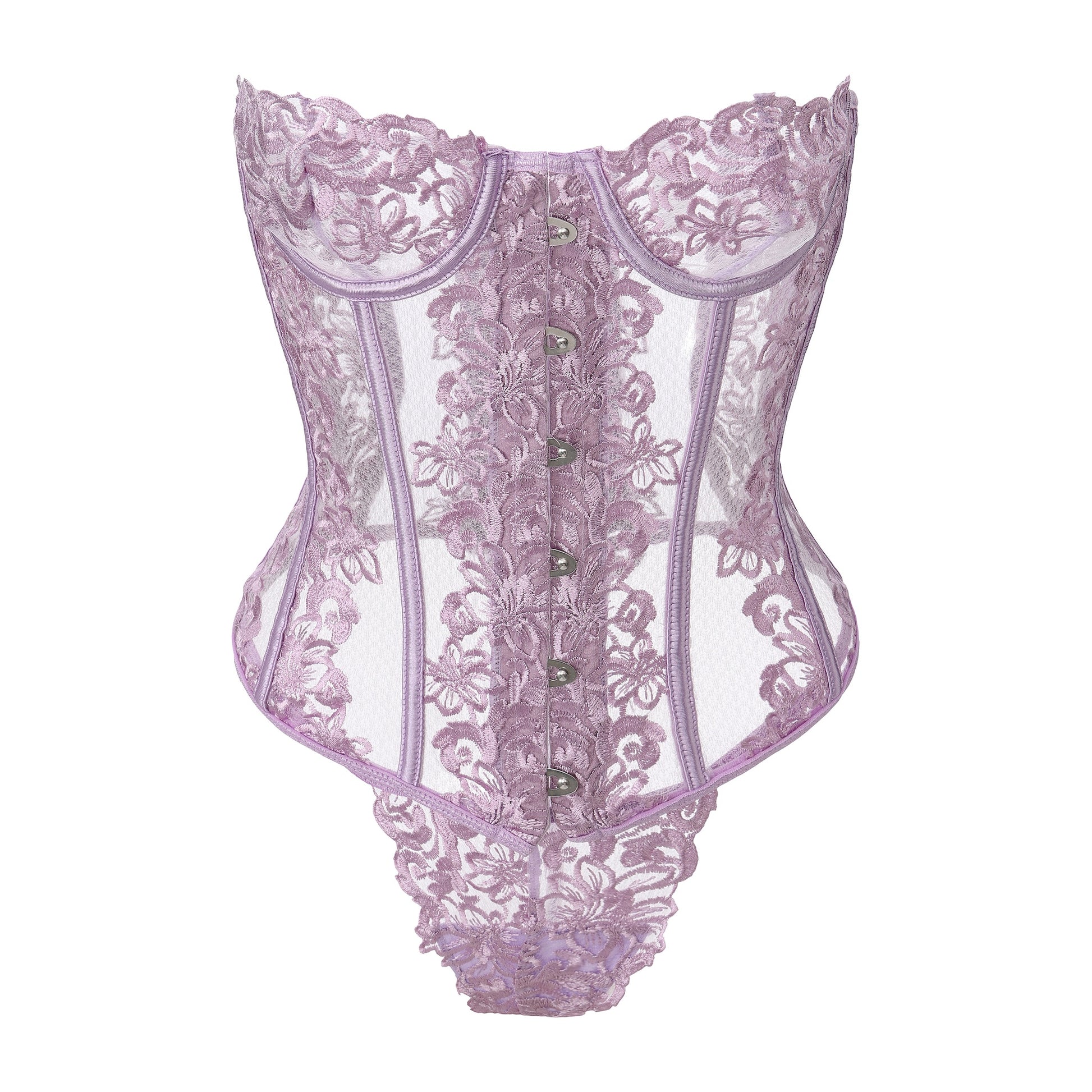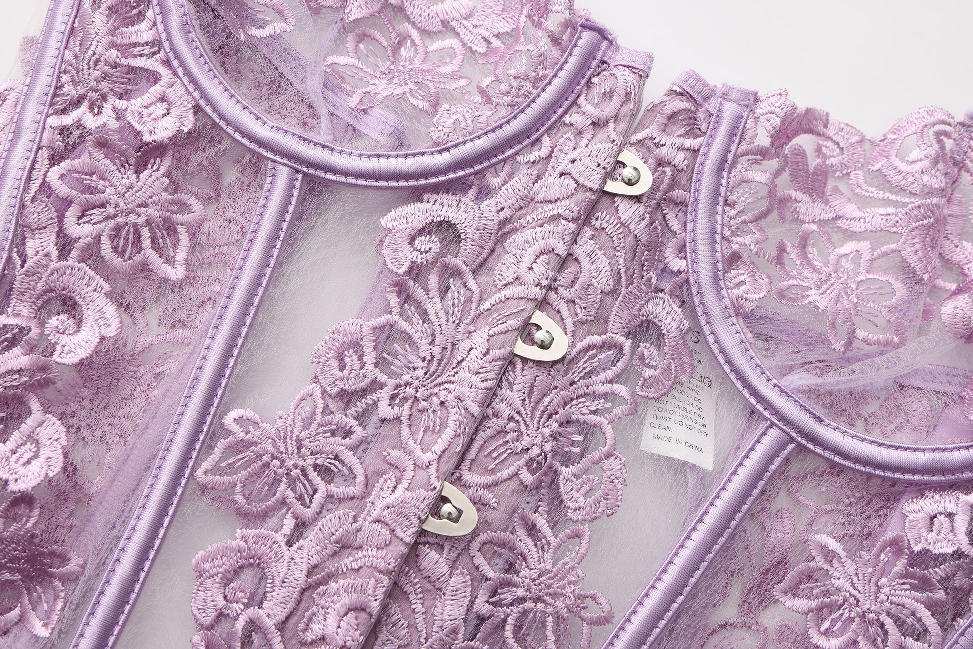 Elevate your lingerie collection with this romantic lavender corset bustier. Designed in sheer mesh with intricate floral lace embroidery, it features supportive boning that sculpts the waist and enhances your silhouette. Satin-trimmed edges and a front button closure add a refined finish, while adjustable straps ensure a comfortable, tailored fit.
