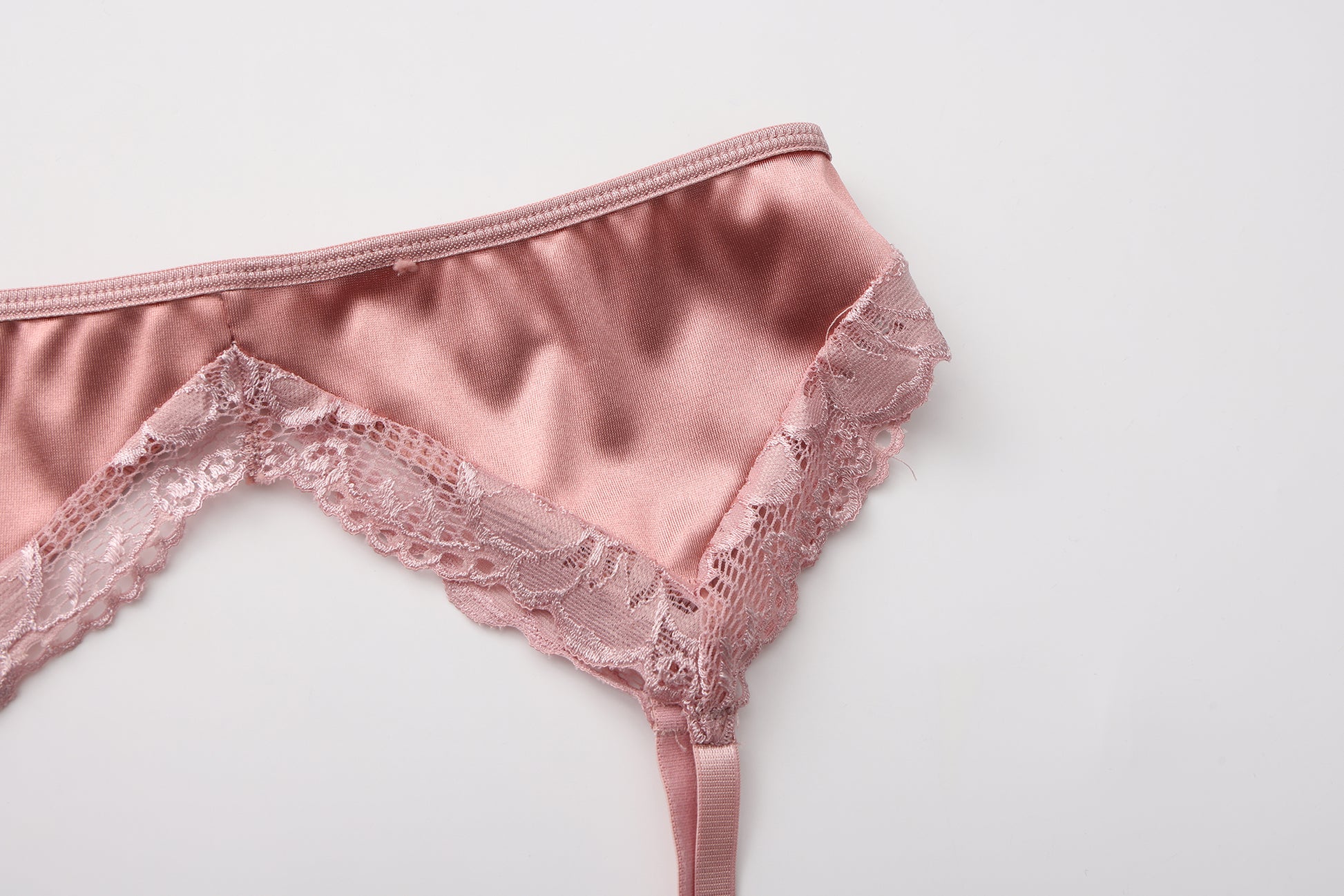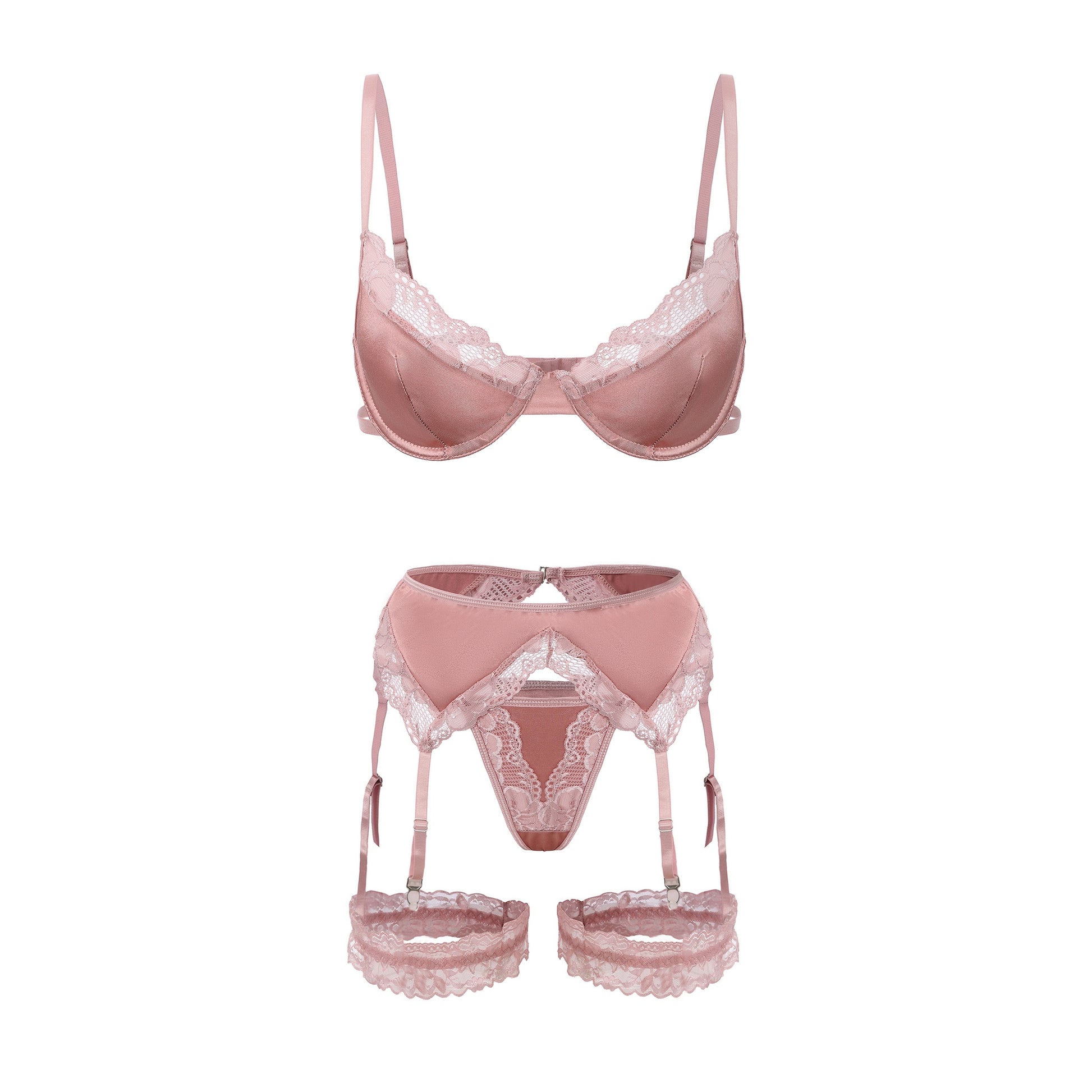 Smooth satin meets delicate lace in this refined three-piece ensemble. The design features supportive structure and soft lace detailing for a flattering, feminine silhouette. Coordinating satin pieces complete the look, trimmed with lace for a touch of sophistication.