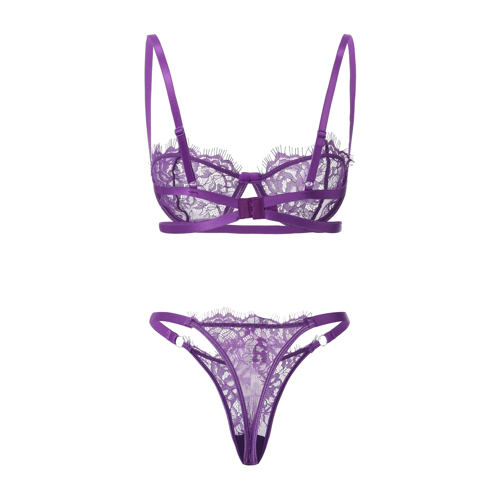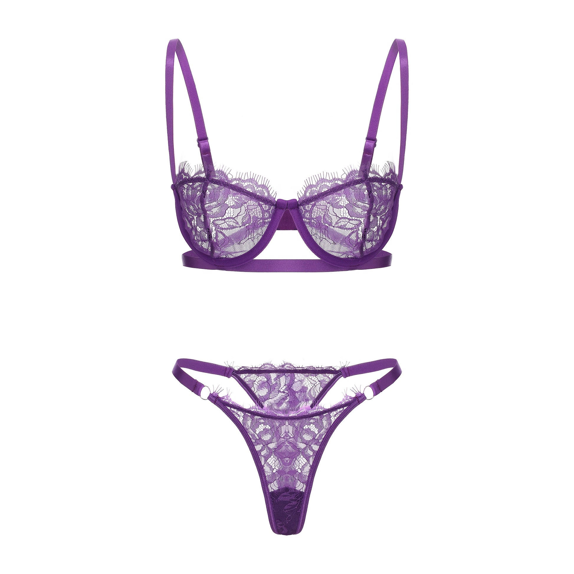 Elegant and effortlessly feminine, this violet lace lingerie set pairs a sheer underwire bra with a matching thong for a refined, graceful look. The bra is crafted from delicate floral lace with slim adjustable straps for a custom fit, while the coordinating thong mirrors the same lace detailing for a cohesive finish.